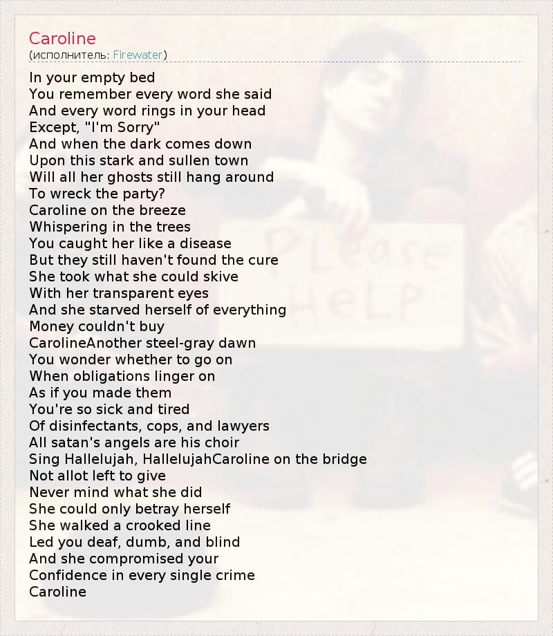 In your empty bed You remember every word she said And every word rings in your head Except, "I'm Sorry" And when the dark comes down Upon this stark and sullen town Will all her ghosts still hang around To wreck the party? Caroline on the breeze Whispering in the trees You caught her like a disease But they still haven't found the cure She took what she could skive With her transparent eyes And she starved herself of everything Money couldn't buy CarolineAnother steel-gray dawn You wonder whether to go on When obligations linger on As if you made them You're so sick and tired Of disinfectants, cops, and lawyers All satan's angels are his choir Sing Hallelujah, HallelujahCaroline on the bridge Not allot left to give Never mind what she did She could only betray herself She walked a crooked line Led you deaf, dumb, and blind And she compromised your Confidence in every single crime Caroline