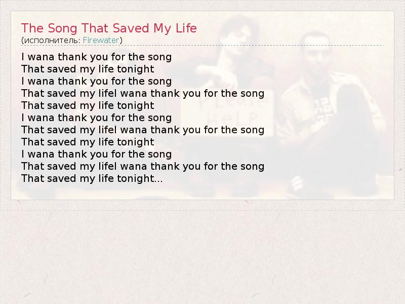 А как ты думаешь, о чем песня "The Song That Saved My Life" ?