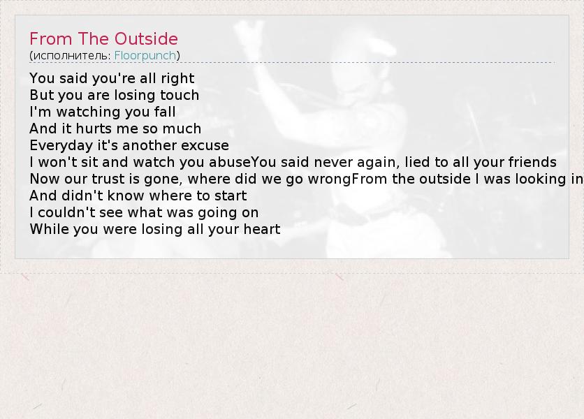 Это интересно:Floorpunch - sXe hardcore-группа из Нью Джерси. Руководит молодым движением возрождения хардкор панка вместе с такими группами, как In My Eyes и Ten Yard Fight.