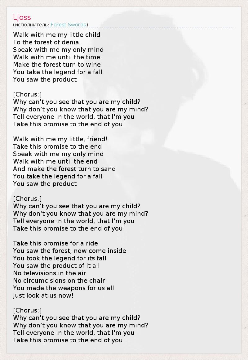 Прогуляйся со мной, мой маленький ребенок, По лесу отрицания. Поговори со мной откровенно, Прогуляйся со мной до момента, когда... Заставь лес превратиться в вино... Ты придумал легенду своего падения, Ты видел результат… [Припев:] Почему ты не видишь, что ты - мой ребенок? Почему ты не знаешь, что ты - мои мысли? Скажи всем на свете, что я - это ты! Унеси эту клятву с собой в могилу... Прогуляйся со мной, мой маленький друг! Унеси эту клятву в могилу… Поговори со мной откровенно, Гуляй со мной до конца.... Заставь лес превратиться в песок, Ты придумал легенду своего падения, Ты видел результат… [Припев:] Почему ты не видишь, что ты - мой ребенок? Почему ты не знаешь, что ты - мои мысли? Скажи всем на свете, что я - это ты! Унеси эту клятву с собой в могилу... Прикончи эту клятву. Ты видел лес, теперь заходи внутрь. Ты придумал легенду своего падения, Ты увидел результат этого всего... Никакого телевидения под открытым небом, Никакого обрезания на стуле... Ты сделал оружие для нас всех, А теперь посмотри на нас! [Припев:] Почему ты не видишь, что ты - мой ребенок? Почему ты не знаешь, что ты - мои мысли? Скажи всем на свете, что я - это ты! Унеси эту клятву с собой в могилу...