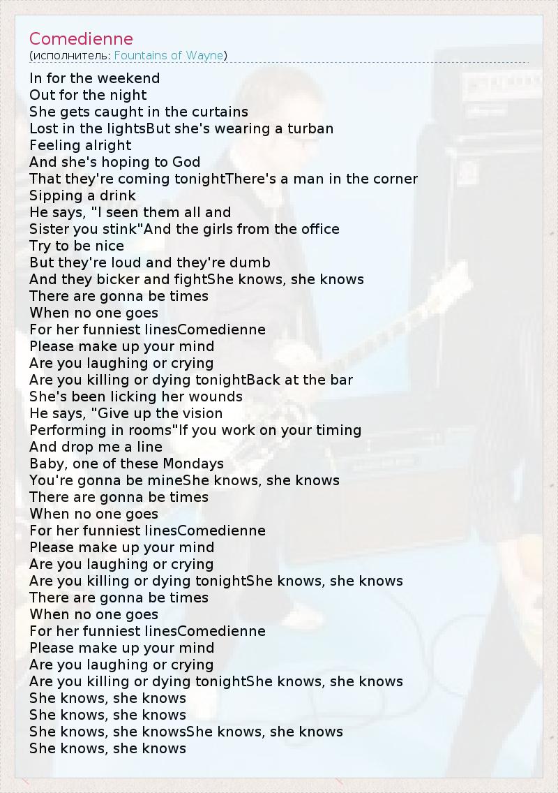Это интересно:Fountains Of Wayne (Фонтаны города Wayne) - поп-рок группа, образованная в 1995 в Уилльямстоуне (Массачусетс, США) басистом Адамом Шлезингером (Adam Schlesinger) и вокалистом/гитаристом Крисом Коллингвудом (Chris Collingwood). Шлезингер и Коллингвуд познакомились в Уилльямсовском колледже в 80-х, но играли в разных группах (Коллингвуд - Merci Buckets, Шлезингер - Ivy). Вновь они встретились в середине 90-х, когда и была образована... продолжение
