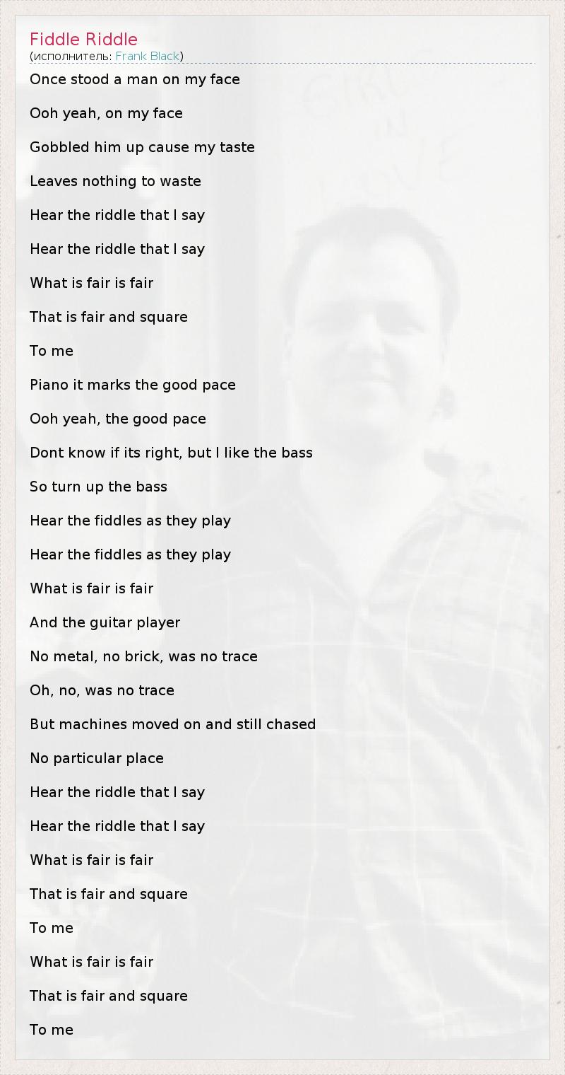 Once stood a man on my face Ooh yeah, on my face Gobbled him up cause my taste Leaves nothing to waste Hear the riddle that I say Hear the riddle that I say What is fair is fair That is fair and square To me Piano it marks the good pace Ooh yeah, the good pace Dont know if its right, but I like the bass So turn up the bass Hear the fiddles as they play Hear the fiddles as they play What is fair is fair And the guitar player No metal, no brick, was no trace Oh, no, was no trace But machines moved on and still chased No particular place Hear the riddle that I say Hear the riddle that I say What is fair is fair That is fair and square To me What is fair is fair That is fair and square To me
