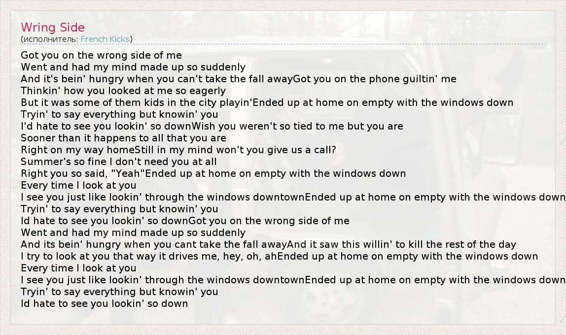 Got you on the wrong side of me Went and had my mind made up so suddenly And it's bein' hungry when you can't take the fall awayGot you on the phone guiltin' me Thinkin' how you looked at me so eagerly But it was some of them kids in the city playin'Ended up at home on empty with the windows down Tryin' to say everything but knowin' you I'd hate to see you lookin' so downWish you weren't so tied to me but you are Sooner than it happens to all that you are Right on my way homeStill in my mind won't you give us a call? Summer's so fine I don't need you at all Right you so said, "Yeah"Ended up at home on empty with the windows down Every time I look at you I see you just like lookin' through the windows downtownEnded up at home on empty with the windows down Tryin' to say everything but knowin' you Id hate to see you lookin' so downGot you on the wrong side of me Went and had my mind made up so suddenly And its bein' hungry when you cant take the fall awayAnd it saw this willin' to kill the rest of the day I try to look at you that way it drives me, hey, oh, ahEnded up at home on empty with the windows down Every time I look at you I see you just like lookin' through the windows downtownEnded up at home on empty with the windows down Tryin' to say everything but knowin' you Id hate to see you lookin' so down