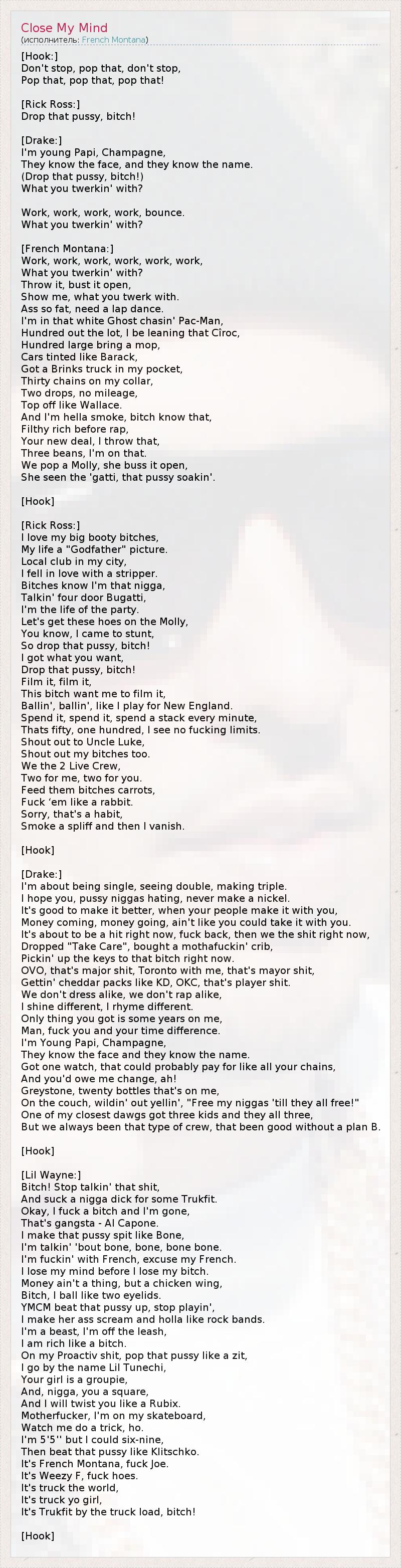 [Hook:] Don't stop, pop that, don't stop, Pop that, pop that, pop that! [Rick Ross:] Drop that pussy, bitch! [Drake:] I'm young Papi, Champagne, They know the face, and they know the name. (Drop that pussy, bitch!) What you twerkin' with? Work, work, work, work, bounce. What you twerkin' with? [French Montana:] Work, work, work, work, work, work, What you twerkin' with? Throw it, bust it open, Show me, what you twerk with. Ass so fat, need a lap dance. I'm in that white Ghost chasin' Pac-Man, Hundred out the lot, I be leaning that Cîroc, Hundred large bring a mop, Cars tinted like Barack, Got a Brinks truck in my pocket, Thirty chains on my collar, Two drops, no mileage, Top off like Wallace. And I'm hella smoke, bitch know that, Filthy rich before rap, Your new deal, I throw that, Three beans, I'm on that. We pop a Molly, she buss it open, She seen the 'gatti, that pussy soakin'. [Hook] [Rick Ross:] I love my big booty bitches, My life a "Godfather" picture. Local club in my city, I fell in love with a stripper. Bitches know I'm that nigga, Talkin' four door Bugatti, I'm the life of the party. Let's get these hoes on the Molly, You know, I came to stunt, So drop that pussy, bitch! I got what you want, Drop that pussy, bitch! Film it, film it, This bitch want me to film it, Ballin', ballin', like I play for New England. Spend it, spend it, spend a stack every minute, Thats fifty, one hundred, I see no fucking limits. Shout out to Uncle Luke, Shout out my bitches too. We the 2 Live Crew, Two for me, two for you. Feed them bitches carrots, Fuck ‘em like a rabbit. Sorry, that's a habit, Smoke a spliff and then I vanish. [Hook] [Drake:] I'm about being single, seeing double, making triple. I hope you, pussy niggas hating, never make a nickel. It's good to make it better, when your people make it with you, Money coming, money going, ain't like you could take it with you. It's about to be a hit right now, fuck back, then we the shit right now, Dropped "Take Care", bought a mothafuckin' crib, Pickin' up the keys to that bitch right now. OVO, that's major shit, Toronto with me, that's mayor shit, Gettin' cheddar packs like KD, OKC, that's player shit. We don't dress alike, we don't rap alike, I shine different, I rhyme different. Only thing you got is some years on me, Man, fuck you and your time difference. I'm Young Papi, Champagne, They know the face and they know the name. Got one watch, that could probably pay for like all your chains, And you'd owe me change, ah! Greystone, twenty bottles that's on me, On the couch, wildin' out yellin', "Free my niggas 'till they all free!" One of my closest dawgs got three kids and they all three, But we always been that type of crew, that been good without a plan B. [Hook] [Lil Wayne:] Bitch! Stop talkin' that shit, And suck a nigga dick for some Trukfit. Okay, I fuck a bitch and I'm gone, That's gangsta - Al Capone. I make that pussy spit like Bone, I'm talkin' 'bout bone, bone, bone bone. I'm fuckin' with French, excuse my French. I lose my mind before I lose my bitch. Money ain't a thing, but a chicken wing, Bitch, I ball like two eyelids. YMCM beat that pussy up, stop playin', I make her ass scream and holla like rock bands. I'm a beast, I'm off the leash, I am rich like a bitch. On my Proactiv shit, pop that pussy like a zit, I go by the name Lil Tunechi, Your girl is a groupie, And, nigga, you a square, And I will twist you like a Rubix. Motherfucker, I'm on my skateboard, Watch me do a trick, ho. I'm 5'5'' but I could six-nine, Then beat that pussy like Klitschko. It's French Montana, fuck Joe. It's Weezy F, fuck hoes. It's truck the world, It's truck yo girl, It's Trukfit by the truck load, bitch! [Hook]