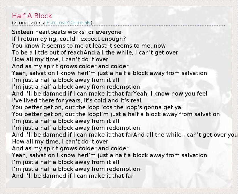 Sixteen heartbeats works for everyone If I return dying, could I expect enough? You know it seems to me at least it seems to me, now To be a little out of reachAnd all the while, I can't get over How all my time, I can't do it over And as my spirit grows colder and colder Yeah, salvation I know herI'm just a half a block away from salvation I'm just a half a block away from it all I'm just a half a block away from redemption And I'll be damned if I can make it that farYeah, I know how you feel I've lived there for years, it's cold and it's real You better get on, out the loop 'cos the loop's gonna get ya' You better get on, out the loopI'm just a half a block away from salvation I'm just a half a block away from it all I'm just a half a block away from redemption And I'll be damned if I can make it that farAnd all the while I can't get over you How all my time, I can't do it over And as my spirit grows colder and colder Yeah, salvation I know herI'm just a half a block away from salvation I'm just a half a block away from it all I'm just a half a block away from redemption And I'll be damned if I can make it that far