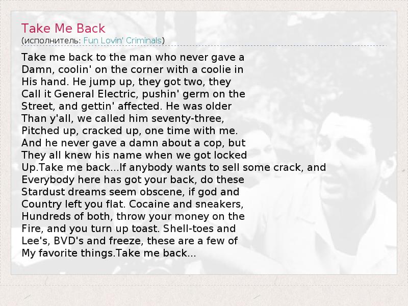 Take me back to the man who never gave a Damn, coolin' on the corner with a coolie in His hand. He jump up, they got two, they Call it General Electric, pushin' germ on the Street, and gettin' affected. He was older Than y'all, we called him seventy-three, Pitched up, cracked up, one time with me. And he never gave a damn about a cop, but They all knew his name when we got locked Up.Take me back...If anybody wants to sell some crack, and Everybody here has got your back, do these Stardust dreams seem obscene, if god and Country left you flat. Cocaine and sneakers, Hundreds of both, throw your money on the Fire, and you turn up toast. Shell-toes and Lee's, BVD's and freeze, these are a few of My favorite things.Take me back...