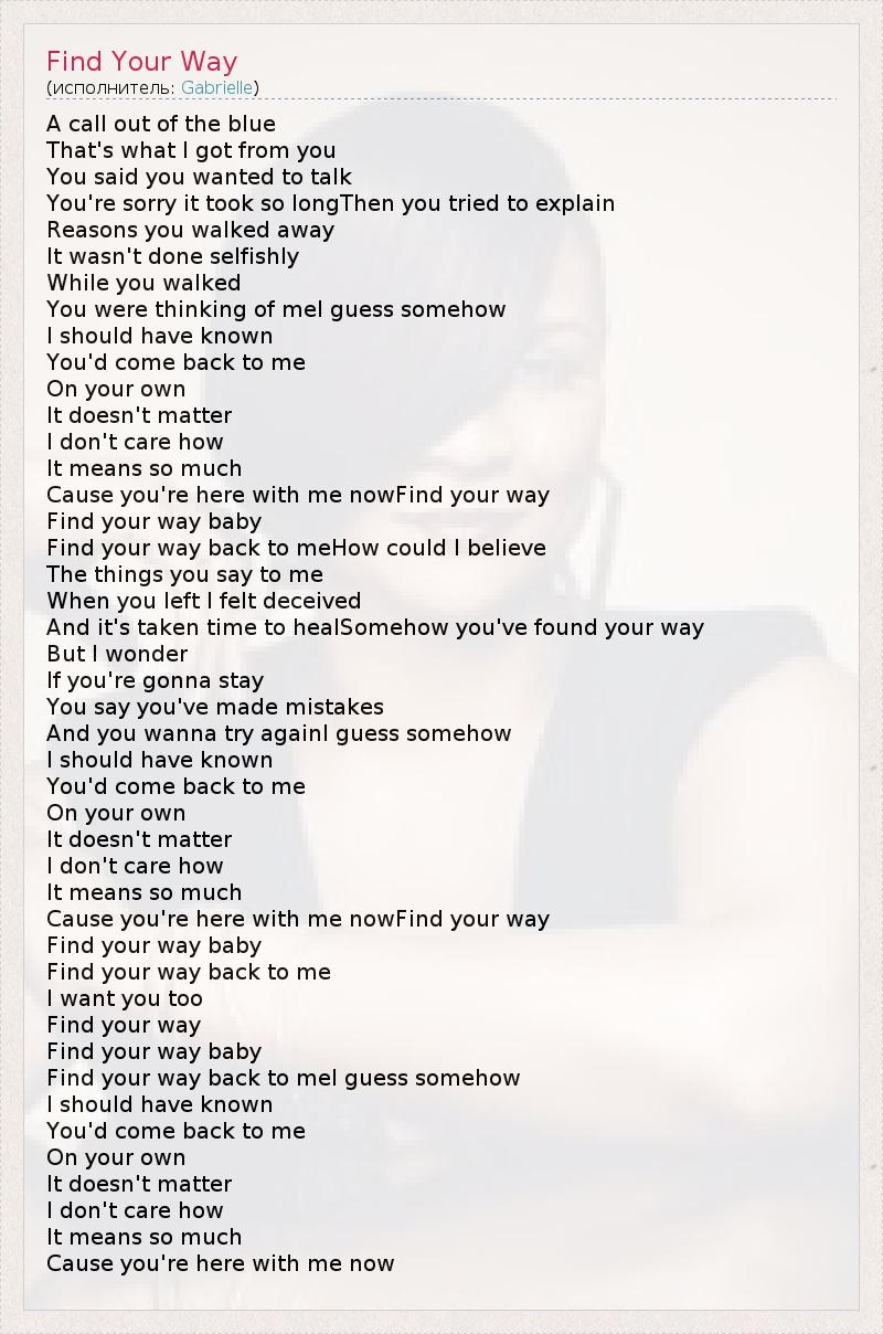A call out of the blue That's what I got from you You said you wanted to talk You're sorry it took so longThen you tried to explain Reasons you walked away It wasn't done selfishly While you walked You were thinking of meI guess somehow I should have known You'd come back to me On your own It doesn't matter I don't care how It means so much Cause you're here with me nowFind your way Find your way baby Find your way back to meHow could I believe The things you say to me When you left I felt deceived And it's taken time to healSomehow you've found your way But I wonder If you're gonna stay You say you've made mistakes And you wanna try againI guess somehow I should have known You'd come back to me On your own It doesn't matter I don't care how It means so much Cause you're here with me nowFind your way Find your way baby Find your way back to me I want you too Find your way Find your way baby Find your way back to meI guess somehow I should have known You'd come back to me On your own It doesn't matter I don't care how It means so much Cause you're here with me now