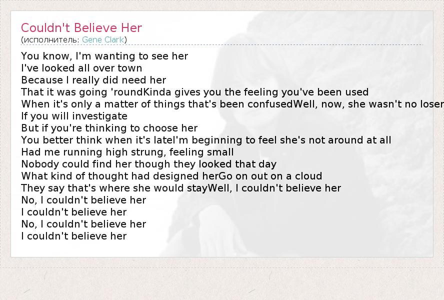 А как ты думаешь, о чем песня "Couldn't Believe Her" ?