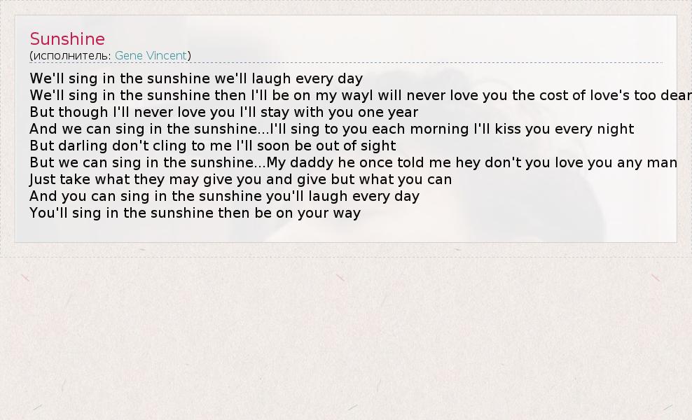 And we can sing in the sunshine...I'll sing to you each morning I'll kiss you every night
