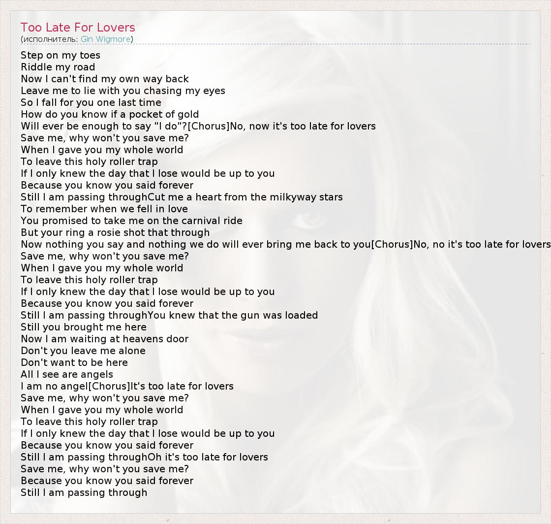 А как ты думаешь, о чем песня "Too Late For Lovers" ?