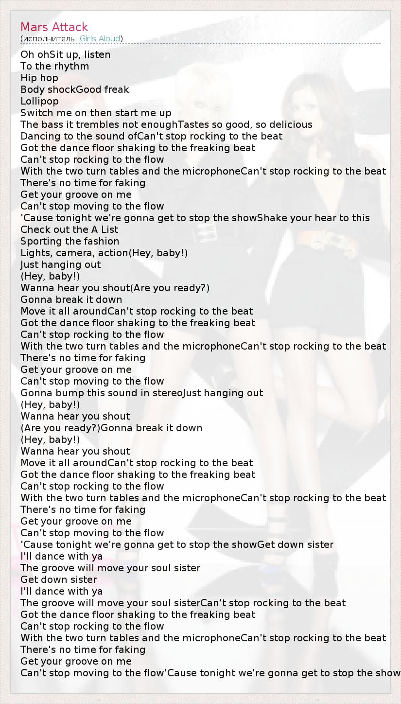 Это интересно:Girls Aloud — британская поп-группа, сформировавшаяся в 2002 году в ходе реалити-шоу канала ITV Popstars: The Rivals. В состав входят Шерил Коул, Сара Хардинг, Никола Робертс, Кимберли Уолш и Надин Койл. Группа выпустила 22 сингла, (21 из которых вошел в первую десятку UK Singles Chart и 4 его возглавили), пять студийных альбомов, два сборника лучших хитов и два альбома ремиксов (два альбома занимали первое место в UK... продолжение