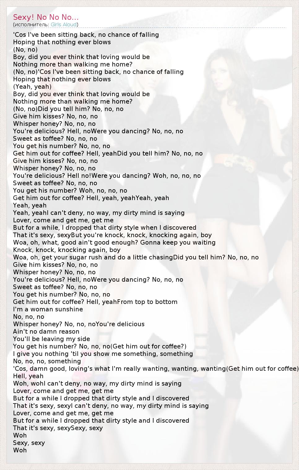 'Cos I've been sitting back, no chance of falling Hoping that nothing ever blows (No, no) Boy, did you ever think that loving would be Nothing more than walking me home? (No, no)'Cos I've been sitting back, no chance of falling Hoping that nothing ever blows (Yeah, yeah) Boy, did you ever think that loving would be Nothing more than walking me home? (No, no)Did you tell him? No, no, no Give him kisses? No, no, no Whisper honey? No, no, no You're delicious? Hell, noWere you dancing? No, no, no Sweet as toffee? No, no, no You get his number? No, no, no Get him out for coffee? Hell, yeahDid you tell him? No, no, no Give him kisses? No, no, no Whisper honey? No, no, no You're delicious? Hell no!Were you dancing? Woh, no, no, no Sweet as toffee? No, no, no You get his number? Woh, no, no, no Get him out for coffee? Hell, yeah, yeahYeah, yeah Yeah, yeah Yeah, yeahI can't deny, no way, my dirty mind is saying Lover, come and get me, get me But for a while, I dropped that dirty style when I discovered That it's sexy, sexyBut you're knock, knock, knocking again, boy Woa, oh, what, good ain't good enough? Gonna keep you waiting Knock, knock, knocking again, boy Woa, oh, get your sugar rush and do a little chasingDid you tell him? No, no, no Give him kisses? No, no, no Whisper honey? No, no, no You're delicious? Hell, noWere you dancing? No, no, no Sweet as toffee? No, no, no You get his number? No, no, no Get him out for coffee? Hell, yeahFrom top to bottom I'm a woman sunshine No, no, no Whisper honey? No, no, noYou're delicious Ain't no damn reason You'll be leaving my side You get his number? No, no, no(Get him out for coffee?) I give you nothing 'til you show me something, something No, no, no, something 'Cos, damn good, loving's what I'm really wanting, wanting, wanting(Get him out for coffee) Hell, yeah Woh, wohI can't deny, no way, my dirty mind is saying Lover, come and get me, get me But for a while I dropped that dirty style and I discovered That it's sexy, sexyI can't deny, no way, my dirty mind is saying Lover, come and get me, get me But for a while I dropped that dirty style and I discovered That it's sexy, sexySexy, sexy Woh Sexy, sexy Woh
