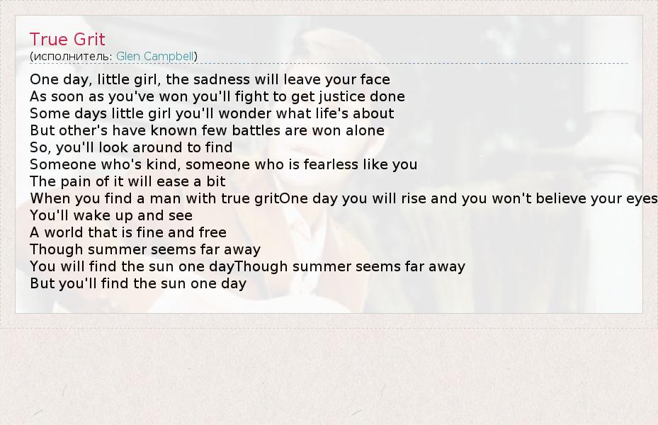 One day, little girl, the sadness will leave your face As soon as you've won you'll fight to get justice done Some days little girl you'll wonder what life's about But other's have known few battles are won alone So, you'll look around to find Someone who's kind, someone who is fearless like you The pain of it will ease a bit When you find a man with true gritOne day you will rise and you won't believe your eyes You'll wake up and see A world that is fine and free Though summer seems far away You will find the sun one dayThough summer seems far away But you'll find the sun one day