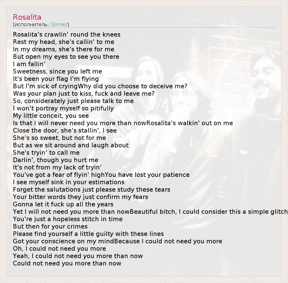 Rosalita's crawlin' round the knees Rest my head, she's callin' to me In my dreams, she's there for me But open my eyes to see you there I am fallin' Sweetness, since you left me It's been your flag I'm flying But I'm sick of cryingWhy did you choose to deceive me? Was your plan just to kiss, fuck and leave me? So, considerately just please talk to me I won't portray myself so pitifully My little conceit, you see Is that I will never need you more than nowRosalita's walkin' out on me Close the door, she's stallin', I see She's so sweet, but not for me But as we sit around and laugh about She's tryin' to call me Darlin', though you hurt me It's not from my lack of tryin' You've got a fear of flyin' highYou have lost your patience I see myself sink in your estimations Forget the salutations just please study these tears Your bitter words they just confirm my fears Gonna let it fuck up all the years Yet I will not need you more than nowBeautiful bitch, I could consider this a simple glitch You're just a hopeless stitch in time But then for your crimes Please find yourself a little guilty with these lines Got your conscience on my mindBecause I could not need you more Oh, I could not need you more Yeah, I could not need you more than now Could not need you more than now