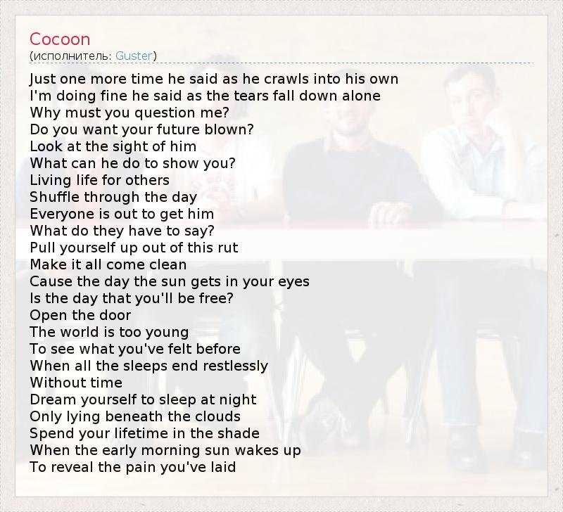 Just one more time he said as he crawls into his own I'm doing fine he said as the tears fall down alone Why must you question me? Do you want your future blown? Look at the sight of him What can he do to show you? Living life for others Shuffle through the day Everyone is out to get him What do they have to say? Pull yourself up out of this rut Make it all come clean Cause the day the sun gets in your eyes Is the day that you'll be free? Open the door The world is too young To see what you've felt before When all the sleeps end restlessly Without time Dream yourself to sleep at night Only lying beneath the clouds Spend your lifetime in the shade When the early morning sun wakes up To reveal the pain you've laid