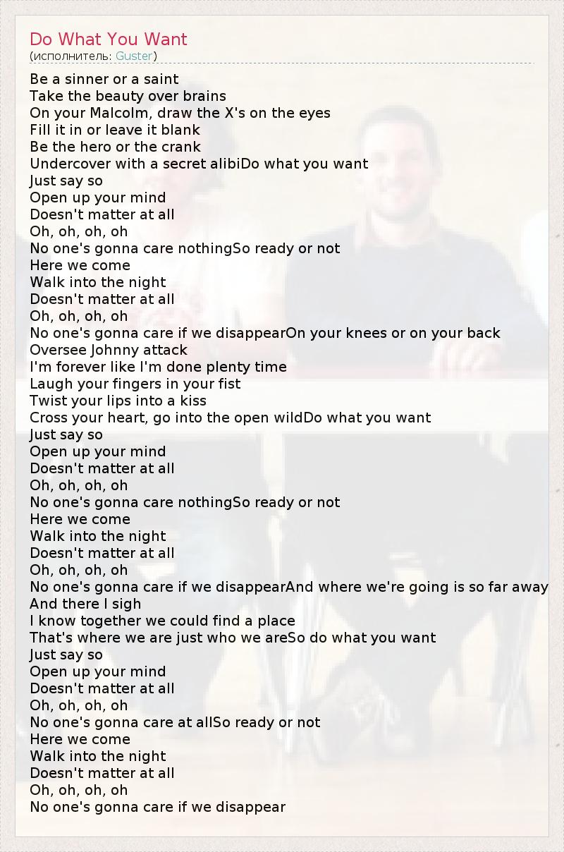 Be a sinner or a saint Take the beauty over brains On your Malcolm, draw the X's on the eyes Fill it in or leave it blank Be the hero or the crank Undercover with a secret alibiDo what you want Just say so Open up your mind Doesn't matter at all Oh, oh, oh, oh No one's gonna care nothingSo ready or not Here we come Walk into the night Doesn't matter at all Oh, oh, oh, oh No one's gonna care if we disappearOn your knees or on your back Oversee Johnny attack I'm forever like I'm done plenty time Laugh your fingers in your fist Twist your lips into a kiss Cross your heart, go into the open wildDo what you want Just say so Open up your mind Doesn't matter at all Oh, oh, oh, oh No one's gonna care nothingSo ready or not Here we come Walk into the night Doesn't matter at all Oh, oh, oh, oh No one's gonna care if we disappearAnd where we're going is so far away And there I sigh I know together we could find a place That's where we are just who we areSo do what you want Just say so Open up your mind Doesn't matter at all Oh, oh, oh, oh No one's gonna care at allSo ready or not Here we come Walk into the night Doesn't matter at all Oh, oh, oh, oh No one's gonna care if we disappear