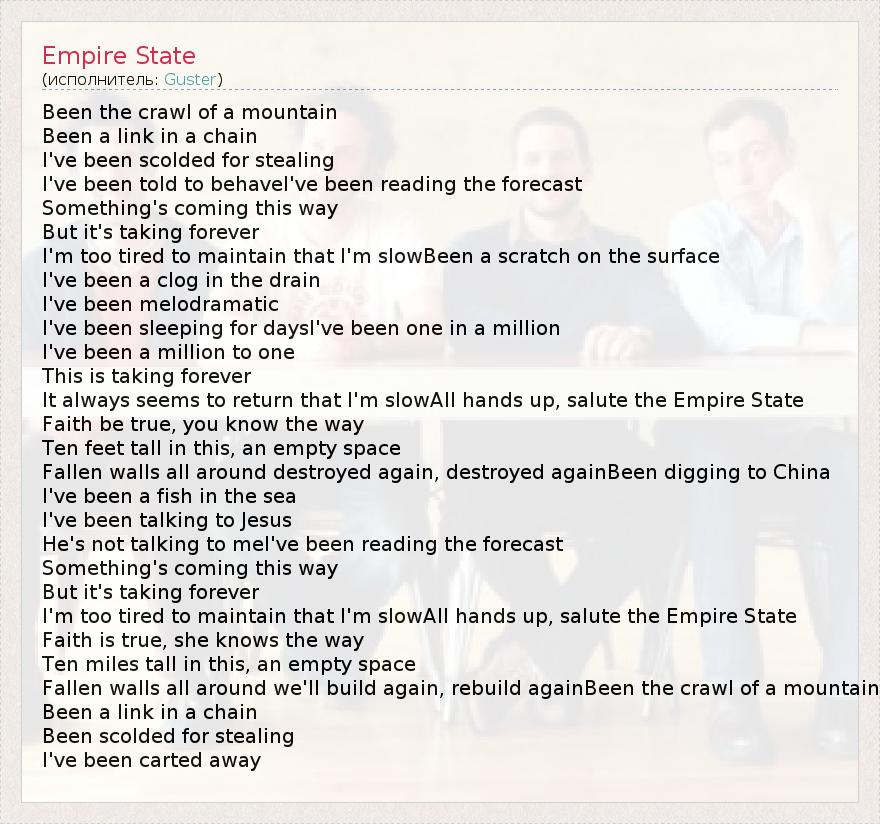 Been the crawl of a mountain Been a link in a chain I've been scolded for stealing I've been told to behaveI've been reading the forecast Something's coming this way But it's taking forever I'm too tired to maintain that I'm slowBeen a scratch on the surface I've been a clog in the drain I've been melodramatic I've been sleeping for daysI've been one in a million I've been a million to one This is taking forever It always seems to return that I'm slowAll hands up, salute the Empire State Faith be true, you know the way Ten feet tall in this, an empty space Fallen walls all around destroyed again, destroyed againBeen digging to China I've been a fish in the sea I've been talking to Jesus He's not talking to meI've been reading the forecast Something's coming this way But it's taking forever I'm too tired to maintain that I'm slowAll hands up, salute the Empire State Faith is true, she knows the way Ten miles tall in this, an empty space Fallen walls all around we'll build again, rebuild againBeen the crawl of a mountain Been a link in a chain Been scolded for stealing I've been carted away