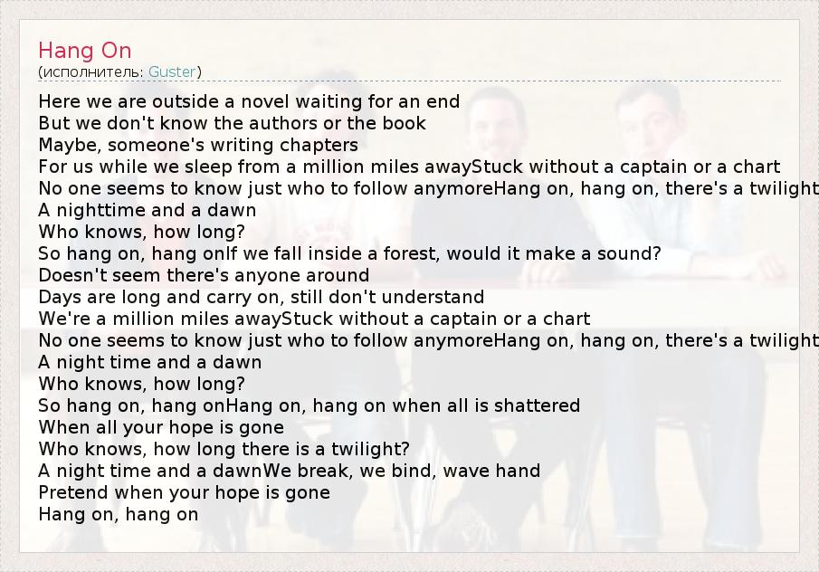 Here we are outside a novel waiting for an end But we don't know the authors or the book Maybe, someone's writing chapters For us while we sleep from a million miles awayStuck without a captain or a chart No one seems to know just who to follow anymoreHang on, hang on, there's a twilight A nighttime and a dawn Who knows, how long? So hang on, hang onIf we fall inside a forest, would it make a sound? Doesn't seem there's anyone around Days are long and carry on, still don't understand We're a million miles awayStuck without a captain or a chart No one seems to know just who to follow anymoreHang on, hang on, there's a twilight A night time and a dawn Who knows, how long? So hang on, hang onHang on, hang on when all is shattered When all your hope is gone Who knows, how long there is a twilight? A night time and a dawnWe break, we bind, wave hand Pretend when your hope is gone Hang on, hang on