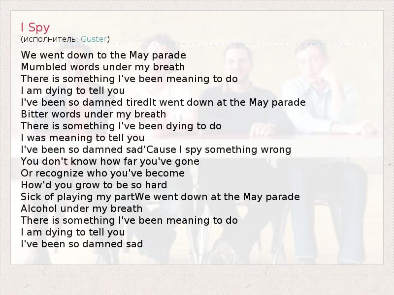 We went down to the May parade Mumbled words under my breath There is something I've been meaning to do I am dying to tell you I've been so damned tiredIt went down at the May parade Bitter words under my breath There is something I've been dying to do I was meaning to tell you I've been so damned sad'Cause I spy something wrong You don't know how far you've gone Or recognize who you've become How'd you grow to be so hard Sick of playing my partWe went down at the May parade Alcohol under my breath There is something I've been meaning to do I am dying to tell you I've been so damned sad