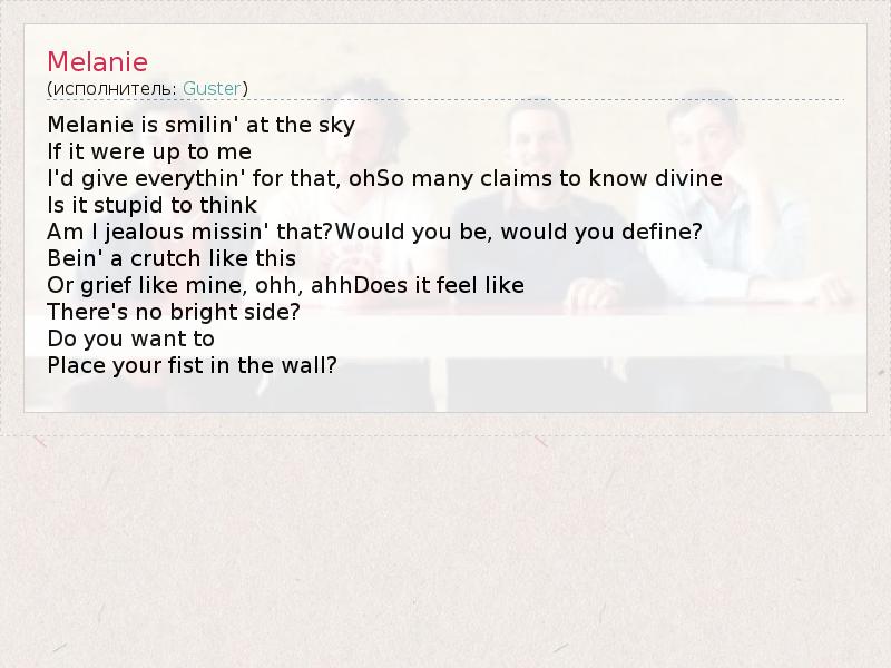 Это интересно:Guster - американская группа альтернативного рока, которая известна ее живыми концертами, юмором, и культом после. Группа сформирована Адамом Гарднером, Раяном Миллером, и Брайеном Розенуоркелем в 1991Группа осталась "подземной" для своих первых двух альбомов, "Parachute" (1994) и "Goldfly" (1997), но ворвалась в музыкальную индустрию в 1999 с ее третьим альбомом студии, "Lost and Gone Forever",... продолжение