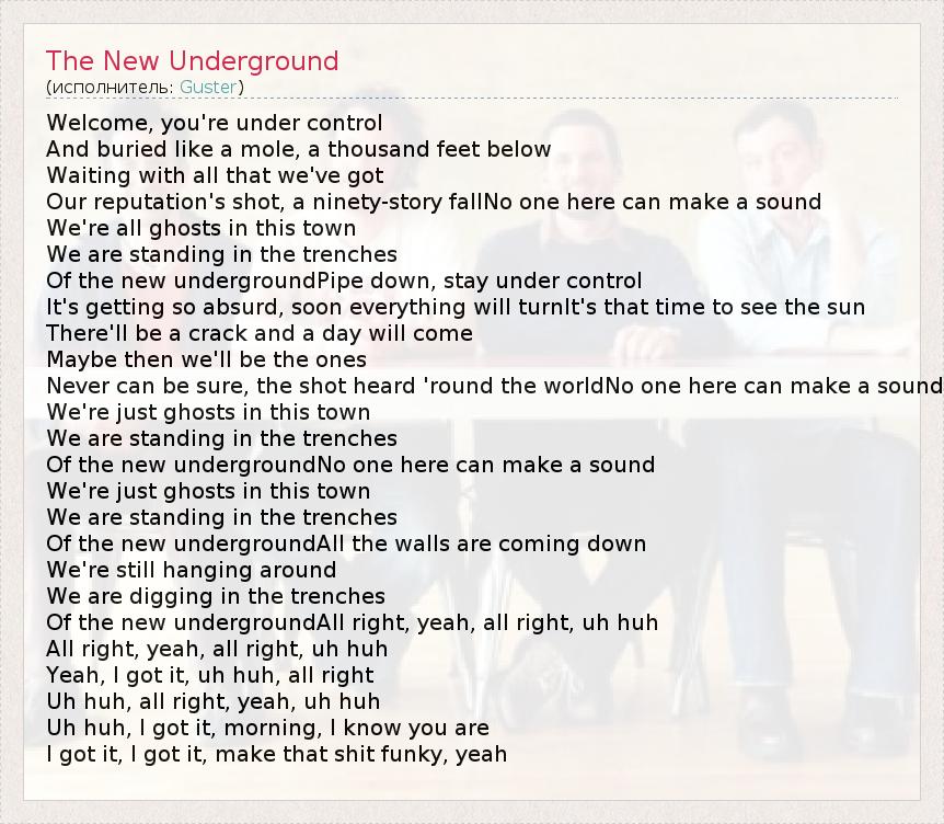 Welcome, you're under control And buried like a mole, a thousand feet below Waiting with all that we've got Our reputation's shot, a ninety-story fallNo one here can make a sound We're all ghosts in this town We are standing in the trenches Of the new undergroundPipe down, stay under control It's getting so absurd, soon everything will turnIt's that time to see the sun There'll be a crack and a day will come Maybe then we'll be the ones Never can be sure, the shot heard 'round the worldNo one here can make a sound We're just ghosts in this town We are standing in the trenches Of the new undergroundNo one here can make a sound We're just ghosts in this town We are standing in the trenches Of the new undergroundAll the walls are coming down We're still hanging around We are digging in the trenches Of the new undergroundAll right, yeah, all right, uh huh All right, yeah, all right, uh huh Yeah, I got it, uh huh, all right Uh huh, all right, yeah, uh huh Uh huh, I got it, morning, I know you are I got it, I got it, make that shit funky, yeah