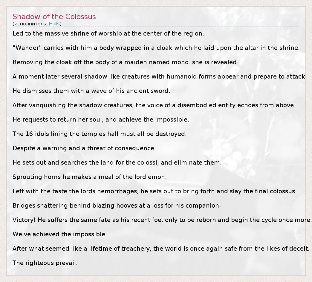 А как ты думаешь, о чем песня "Shadow of the Colossus" ?