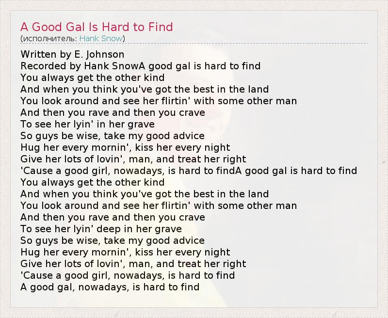 Written by E. Johnson Recorded by Hank SnowA good gal is hard to find You always get the other kind And when you think you've got the best in the land You look around and see her flirtin' with some other man And then you rave and then you crave To see her lyin' in her grave So guys be wise, take my good advice Hug her every mornin', kiss her every night Give her lots of lovin', man, and treat her right 'Cause a good girl, nowadays, is hard to findA good gal is hard to find You always get the other kind And when you think you've got the best in the land You look around and see her flirtin' with some other man And then you rave and then you crave To see her lyin' deep in her grave So guys be wise, take my good advice Hug her every mornin', kiss her every night Give her lots of lovin', man, and treat her right 'Cause a good girl, nowadays, is hard to find A good gal, nowadays, is hard to find