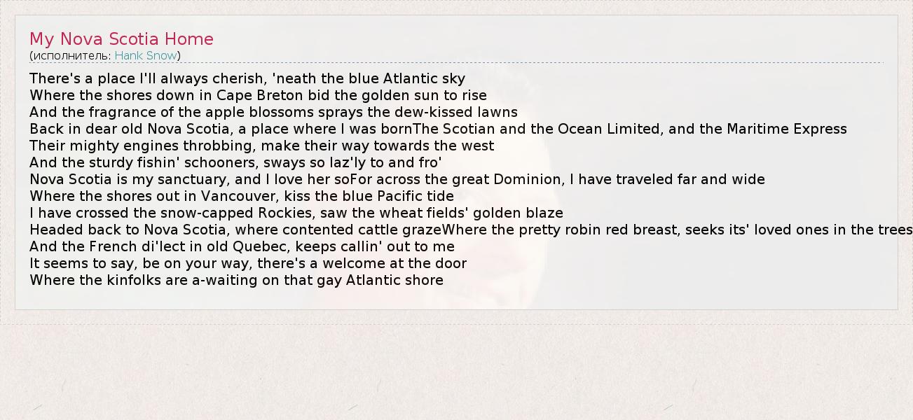 There's a place I'll always cherish, 'neath the blue Atlantic sky Where the shores down in Cape Breton bid the golden sun to rise And the fragrance of the apple blossoms sprays the dew-kissed lawns Back in dear old Nova Scotia, a place where I was bornThe Scotian and the Ocean Limited, and the Maritime Express Their mighty engines throbbing, make their way towards the west And the sturdy fishin' schooners, sways so laz'ly to and fro' Nova Scotia is my sanctuary, and I love her soFor across the great Dominion, I have traveled far and wide Where the shores out in Vancouver, kiss the blue Pacific tide I have crossed the snow-capped Rockies, saw the wheat fields' golden blaze Headed back to Nova Scotia, where contented cattle grazeWhere the pretty robin red breast, seeks its' loved ones in the trees And the French di'lect in old Quebec, keeps callin' out to me It seems to say, be on your way, there's a welcome at the door Where the kinfolks are a-waiting on that gay Atlantic shore