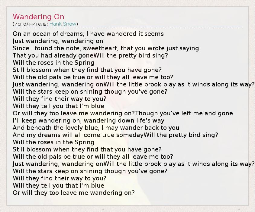 On an ocean of dreams, I have wandered it seems Just wandering, wandering on Since I found the note, sweetheart, that you wrote just saying That you had already goneWill the pretty bird sing? Will the roses in the Spring Still blossom when they find that you have gone? Will the old pals be true or will they all leave me too? Just wandering, wandering onWill the little brook play as it winds along its way? Will the stars keep on shining though you've gone? Will they find their way to you? Will they tell you that I'm blue Or will they too leave me wandering on?Though you've left me and gone I'll keep wandering on, wandering down life's way And beneath the lovely blue, I may wander back to you And my dreams will all come true somedayWill the pretty bird sing? Will the roses in the Spring Still blossom when they find that you have gone? Will the old pals be true or will they all leave me too? Just wandering, wandering onWill the little brook play as it winds along its way? Will the stars keep on shining though you've gone? Will they find their way to you? Will they tell you that I'm blue Or will they too leave me wandering on?