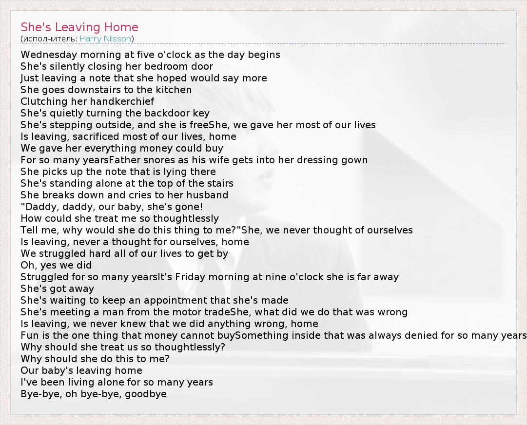 Wednesday morning at five o'clock as the day begins She's silently closing her bedroom door Just leaving a note that she hoped would say more She goes downstairs to the kitchen Clutching her handkerchief She's quietly turning the backdoor key She's stepping outside, and she is freeShe, we gave her most of our lives Is leaving, sacrificed most of our lives, home We gave her everything money could buy For so many yearsFather snores as his wife gets into her dressing gown She picks up the note that is lying there She's standing alone at the top of the stairs She breaks down and cries to her husband "Daddy, daddy, our baby, she's gone! How could she treat me so thoughtlessly Tell me, why would she do this thing to me?"She, we never thought of ourselves Is leaving, never a thought for ourselves, home We struggled hard all of our lives to get by Oh, yes we did Struggled for so many yearsIt's Friday morning at nine o'clock she is far away She's got away She's waiting to keep an appointment that she's made She's meeting a man from the motor tradeShe, what did we do that was wrong Is leaving, we never knew that we did anything wrong, home Fun is the one thing that money cannot buySomething inside that was always denied for so many years Why should she treat us so thoughtlessly? Why should she do this to me? Our baby's leaving home I've been living alone for so many years Bye-bye, oh bye-bye, goodbye