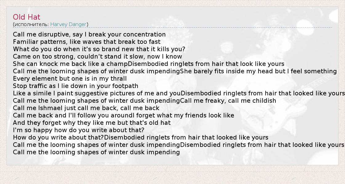 Это интересно:Альтернативный поп-квартет Harvey Danger был сформирован в Сиэтле в 1994 году в Университете штата Вашингтон из студентов Шон Нельсон (вокал), Джефф Лин (гитара), Аарон Хаффмана (бас) и Эван Sult (ударные). Вначале они просто подряжались играть кавер-версий своих любимых песен на вечеринках. В 1996 году они объединились с известным местным производителем Джоном Гудмэнсоном (John Goodmanson) в записи треков,... продолжение