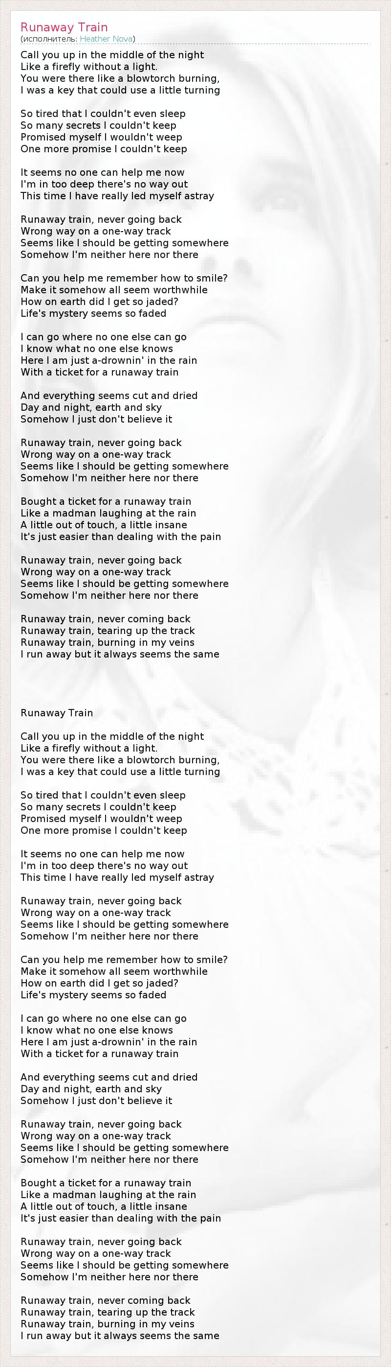 Call you up in the middle of the night Like a firefly without a light. You were there like a blowtorch burning, I was a key that could use a little turning So tired that I couldn't even sleep So many secrets I couldn't keep Promised myself I wouldn't weep One more promise I couldn't keep It seems no one can help me now I'm in too deep there's no way out This time I have really led myself astray Runaway train, never going back Wrong way on a one-way track Seems like I should be getting somewhere Somehow I'm neither here nor there Can you help me remember how to smile? Make it somehow all seem worthwhile How on earth did I get so jaded? Life's mystery seems so faded I can go where no one else can go I know what no one else knows Here I am just a-drownin' in the rain With a ticket for a runaway train And everything seems cut and dried Day and night, earth and sky Somehow I just don't believe it Runaway train, never going back Wrong way on a one-way track Seems like I should be getting somewhere Somehow I'm neither here nor there Bought a ticket for a runaway train Like a madman laughing at the rain A little out of touch, a little insane It's just easier than dealing with the pain Runaway train, never going back Wrong way on a one-way track Seems like I should be getting somewhere Somehow I'm neither here nor there Runaway train, never coming back Runaway train, tearing up the track Runaway train, burning in my veins I run away but it always seems the same Runaway Train Call you up in the middle of the night Like a firefly without a light. You were there like a blowtorch burning, I was a key that could use a little turning So tired that I couldn't even sleep So many secrets I couldn't keep Promised myself I wouldn't weep One more promise I couldn't keep It seems no one can help me now I'm in too deep there's no way out This time I have really led myself astray Runaway train, never going back Wrong way on a one-way track Seems like I should be getting somewhere Somehow I'm neither here nor there Can you help me remember how to smile? Make it somehow all seem worthwhile How on earth did I get so jaded? Life's mystery seems so faded I can go where no one else can go I know what no one else knows Here I am just a-drownin' in the rain With a ticket for a runaway train And everything seems cut and dried Day and night, earth and sky Somehow I just don't believe it Runaway train, never going back Wrong way on a one-way track Seems like I should be getting somewhere Somehow I'm neither here nor there Bought a ticket for a runaway train Like a madman laughing at the rain A little out of touch, a little insane It's just easier than dealing with the pain Runaway train, never going back Wrong way on a one-way track Seems like I should be getting somewhere Somehow I'm neither here nor there Runaway train, never coming back Runaway train, tearing up the track Runaway train, burning in my veins I run away but it always seems the same
