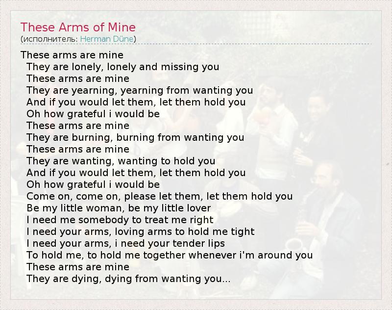 These arms are mine They are lonely, lonely and missing you These arms are mine They are yearning, yearning from wanting you And if you would let them, let them hold you Oh how grateful i would be These arms are mine They are burning, burning from wanting you These arms are mine They are wanting, wanting to hold you And if you would let them, let them hold you Oh how grateful i would be Come on, come on, please let them, let them hold you Be my little woman, be my little lover I need me somebody to treat me right I need your arms, loving arms to hold me tight I need your arms, i need your tender lips To hold me, to hold me together whenever i'm around you These arms are mine They are dying, dying from wanting you...