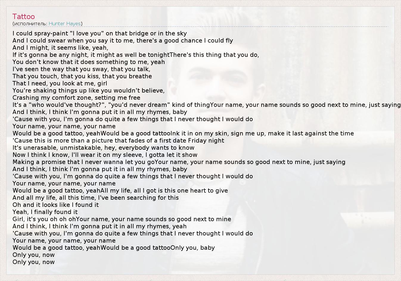 I could spray-paint "I love you" on that bridge or in the sky And I could swear when you say it to me, there's a good chance I could fly And I might, it seems like, yeah, If it's gonna be any night, it might as well be tonightThere's this thing that you do, You don't know that it does something to me, yeah I've seen the way that you sway, that you talk, That you touch, that you kiss, that you breathe That I need, you look at me, girl You're shaking things up like you wouldn't believe, Crashing my comfort zone, setting me free It's a "who would've thought?", "you'd never dream" kind of thingYour name, your name sounds so good next to mine, just saying And I think, I think I'm gonna put it in all my rhymes, baby 'Cause with you, I'm gonna do quite a few things that I never thought I would do Your name, your name, your name Would be a good tattoo, yeahWould be a good tattooInk it in on my skin, sign me up, make it last against the time 'Cause this is more than a picture that fades of a first date Friday night It's unerasable, unmistakable, hey, everybody wants to know Now I think I know, I'll wear it on my sleeve, I gotta let it show Making a promise that I never wanna let you goYour name, your name sounds so good next to mine, just saying And I think, I think I'm gonna put it in all my rhymes, baby 'Cause with you, I'm gonna do quite a few things that I never thought I would do Your name, your name, your name Would be a good tattoo, yeahAll my life, all I got is this one heart to give And all my life, all this time, I've been searching for this Oh and it looks like I found it Yeah, I finally found it Girl, it's you oh oh ohYour name, your name sounds so good next to mine And I think, I think I'm gonna put it in all my rhymes, yeah 'Cause with you, I'm gonna do quite a few things that I never thought I would do Your name, your name, your name Would be a good tattoo, yeahWould be a good tattooOnly you, baby Only you, now Only you, now