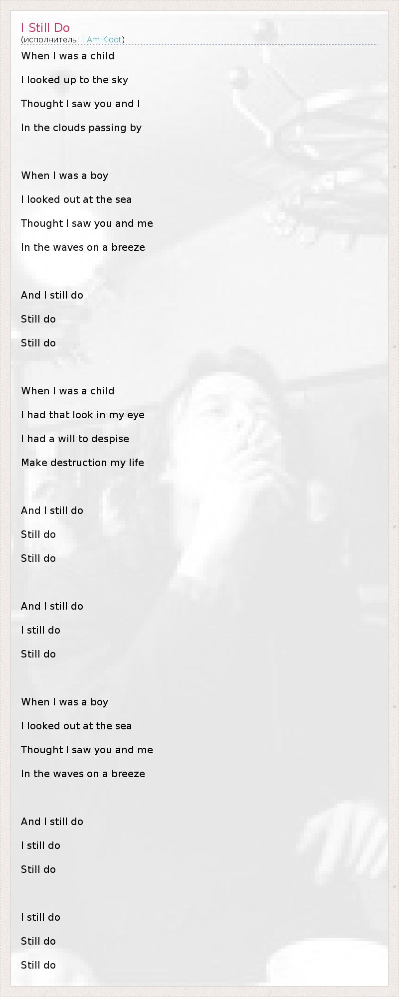 When I was a child I looked up to the sky Thought I saw you and I In the clouds passing by When I was a boy I looked out at the sea Thought I saw you and me In the waves on a breeze And I still do Still do Still do When I was a child I had that look in my eye I had a will to despise Make destruction my life And I still do Still do Still do And I still do I still do Still do When I was a boy I looked out at the sea Thought I saw you and me In the waves on a breeze And I still do I still do Still do I still do Still do Still do