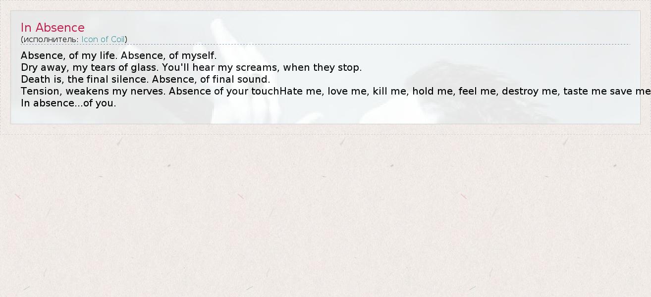 Это интересно:В 1997 г. Andy LaPlegua основал новый проект Icon Of Coil, который изначально строился как концепт логотипа, графического дизайна и музыки. Но с началом существования проекта музыка стала наиболее существенным элементом Icon Of Coil для Энди, поэтому он пригласил для живых выступлений Себастиана Комора (Sebastian Komor), с которым в 1996 г. работал в проекте Sector... продолжение