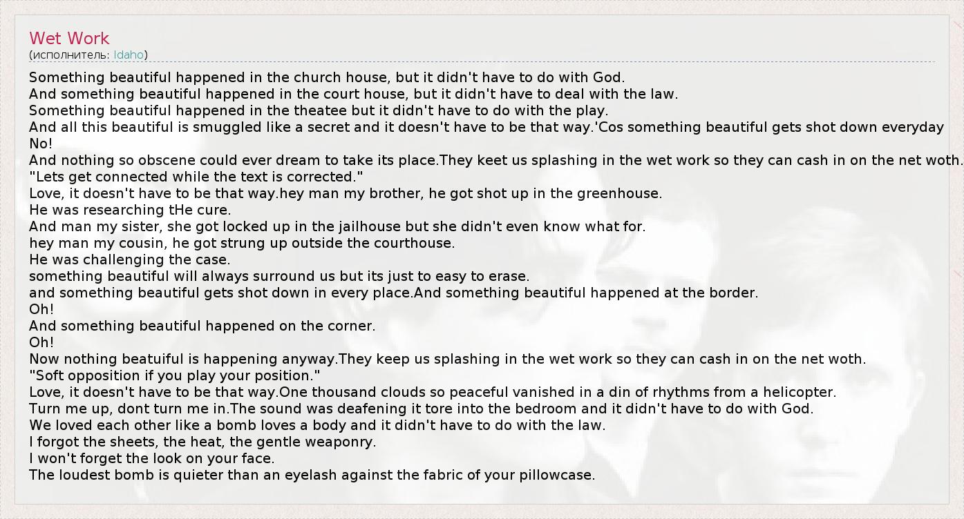 Something beautiful happened in the church house, but it didn't have to do with God. And something beautiful happened in the court house, but it didn't have to deal with the law. Something beautiful happened in the theatee but it didn't have to do with the play. And all this beautiful is smuggled like a secret and it doesn't have to be that way.'Cos something beautiful gets shot down everyday No! And nothing so obscene could ever dream to take its place.They keet us splashing in the wet work so they can cash in on the net woth. "Lets get connected while the text is corrected." Love, it doesn't have to be that way.hey man my brother, he got shot up in the greenhouse. He was researching tHe cure. And man my sister, she got locked up in the jailhouse but she didn't even know what for. hey man my cousin, he got strung up outside the courthouse. He was challenging the case. something beautiful will always surround us but its just to easy to erase. and something beautiful gets shot down in every place.And something beautiful happened at the border. Oh! And something beautiful happened on the corner. Oh! Now nothing beatuiful is happening anyway.They keep us splashing in the wet work so they can cash in on the net woth. "Soft opposition if you play your position." Love, it doesn't have to be that way.One thousand clouds so peaceful vanished in a din of rhythms from a helicopter. Turn me up, dont turn me in.The sound was deafening it tore into the bedroom and it didn't have to do with God. We loved each other like a bomb loves a body and it didn't have to do with the law. I forgot the sheets, the heat, the gentle weaponry. I won't forget the look on your face. The loudest bomb is quieter than an eyelash against the fabric of your pillowcase.