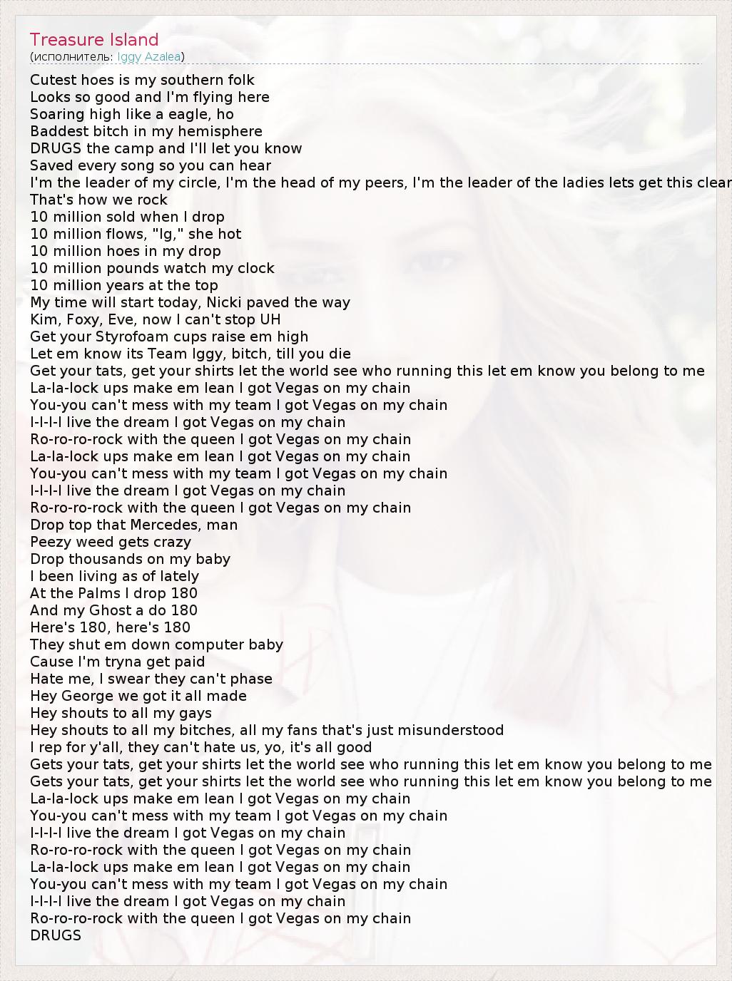 Cutest hoes is my southern folk Looks so good and I'm flying here Soaring high like a eagle, ho Baddest bitch in my hemisphere DRUGS the camp and I'll let you know Saved every song so you can hear I'm the leader of my circle, I'm the head of my peers, I'm the leader of the ladies lets get this clear That's how we rock 10 million sold when I drop 10 million flows, "Ig," she hot 10 million hoes in my drop 10 million pounds watch my clock 10 million years at the top My time will start today, Nicki paved the way Kim, Foxy, Eve, now I can't stop UH Get your Styrofoam cups raise em high Let em know its Team Iggy, bitch, till you die Get your tats, get your shirts let the world see who running this let em know you belong to me La-la-lock ups make em lean I got Vegas on my chain You-you can't mess with my team I got Vegas on my chain I-I-I-I live the dream I got Vegas on my chain Ro-ro-ro-rock with the queen I got Vegas on my chain La-la-lock ups make em lean I got Vegas on my chain You-you can't mess with my team I got Vegas on my chain I-I-I-I live the dream I got Vegas on my chain Ro-ro-ro-rock with the queen I got Vegas on my chain Drop top that Mercedes, man Peezy weed gets crazy Drop thousands on my baby I been living as of lately At the Palms I drop 180 And my Ghost a do 180 Here's 180, here's 180 They shut em down computer baby Cause I'm tryna get paid Hate me, I swear they can't phase Hey George we got it all made Hey shouts to all my gays Hey shouts to all my bitches, all my fans that's just misunderstood I rep for y'all, they can't hate us, yo, it's all good Gets your tats, get your shirts let the world see who running this let em know you belong to me Gets your tats, get your shirts let the world see who running this let em know you belong to me La-la-lock ups make em lean I got Vegas on my chain You-you can't mess with my team I got Vegas on my chain I-I-I-I live the dream I got Vegas on my chain Ro-ro-ro-rock with the queen I got Vegas on my chain La-la-lock ups make em lean I got Vegas on my chain You-you can't mess with my team I got Vegas on my chain I-I-I-I live the dream I got Vegas on my chain Ro-ro-ro-rock with the queen I got Vegas on my chain DRUGS