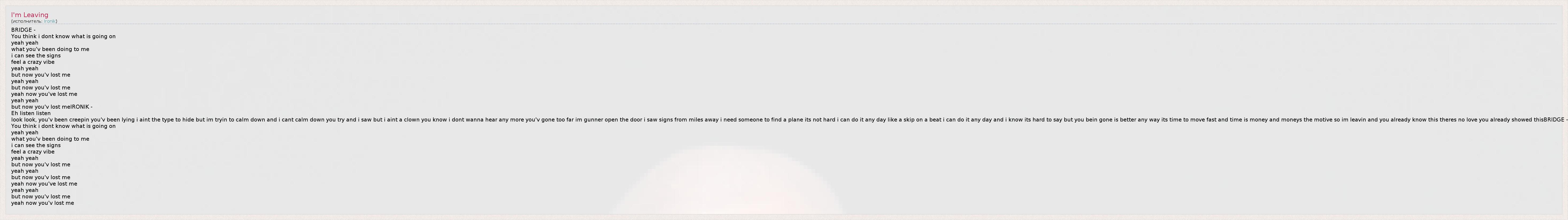 BRIDGE - You think i dont know what is going on yeah yeah what you'v been doing to me i can see the signs feel a crazy vibe yeah yeah but now you'v lost me yeah yeah but now you'v lost me yeah now you've lost me yeah yeah but now you'v lost meIRONIK - Eh listen listen look look, you'v been creepin you'v been lying i aint the type to hide but im tryin to calm down and i cant calm down you try and i saw but i aint a clown you know i dont wanna hear any more you'v gone too far im gunner open the door i saw signs from miles away i need someone to find a plane its not hard i can do it any day like a skip on a beat i can do it any day and i know its hard to say but you bein gone is better any way its time to move fast and time is money and moneys the motive so im leavin and you already know this theres no love you already showed thisBRIDGE - You think i dont know what is going on yeah yeah what you'v been doing to me i can see the signs feel a crazy vibe yeah yeah but now you'v lost me yeah yeah but now you'v lost me yeah now you've lost me yeah yeah but now you'v lost me yeah now you'v lost me