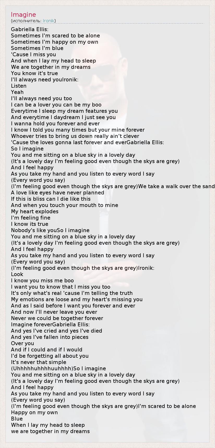 Gabriella Ellis: Sometimes I'm scared to be alone Sometimes I'm happy on my own Sometimes I'm blue 'Cause I miss you And when I lay my head to sleep We are together in my dreams You know it's true I'll always need youIronik: Listen Yeah I'll always need you too I can be a lover you can be my boo Everytime I sleep my dream features you And everytime I daydream I just see you I wanna hold you forever and ever I know I told you many times but your mine forever Whoever tries to bring us down really ain't clever 'Cause the loves gonna last forever and everGabriella Ellis: So I imagine You and me sitting on a blue sky in a lovely day (It's a lovely day I'm feeling good even though the skys are grey) And I feel happy As you take my hand and you listen to every word I say (Every word you say) (I'm feeling good even though the skys are grey)We take a walk over the sand A love like eyes have never planned If this is bliss can I die like this And when you touch your mouth to mine My heart explodes I'm feeling fine I know its true Nobody's like youSo I imagine You and me sitting on a blue sky in a lovely day (It's a lovely day I'm feeling good even though the skys are grey) And I feel happy As you take my hand and you listen to every word I say (Every word you say) (I'm feeling good even though the skys are grey)Ironik: Look I know you miss me boo I want you to know that I miss you too It's only what's real 'cause I'm telling the truth My emotions are loose and my heart's missing you And as I said before I want you forever and ever And now I'll never leave you ever Never we could be together forever Imagine foreverGabriella Ellis: And yes I've cried and yes I've died And yes I've fallen into pieces Over you And if I could and if I would I'd be forgetting all about you It's never that simple (Uhhhhhuhhhhuuhhhh)So I imagine You and me sitting on a blue sky in a lovely day (It's a lovely day I'm feeling good even though the skys are grey) And I feel happy As you take my hand and you listen to every word I say (Every word you say) (I'm feeling good even though the skys are grey)I'm scared to be alone Happy on my own Blue When I lay my head to sleep we are together in my dreams