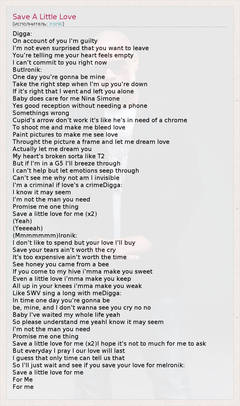 Digga: On account of you I'm guilty I'm not even surprised that you want to leave You're telling me your heart feels empty I can't commit to you right now ButIronik: One day you're gonna be mine Take the right step when I'm up you're down If it's right that I went and left you alone Baby does care for me Nina Simone Yes good reception without needing a phone Somethings wrong Cupid's arrow don't work it's like he's in need of a chrome To shoot me and make me bleed love Paint pictures to make me see love Throught the picture a frame and let me dream love Actually let me dream you My heart's broken sorta like T2 But if I'm in a G5 I'll breeze through I can't help but let emotions seep through Can't see me why not am I invisible I'm a criminal if love's a crimeDigga: I know it may seem I'm not the man you need Promise me one thing Save a little love for me (x2) (Yeah) (Yeeeeah) (Mmmmmmm)Ironik: I don't like to spend but your love I'll buy Save your tears ain't worth the cry It's too expensive ain't worth the time See honey you came from a bee If you come to my hive i'mma make you sweet Even a little love i'mma make you keep All up in your knees i'mma make you weak Like SWV sing a long with meDigga: In time one day you're gonna be be, mine, and I don't wanna see you cry no no Baby I've waited my whole life yeah So please understand me yeahI know it may seem I'm not the man you need Promise me one thing Save a little love for me (x2)I hope it's not to much for me to ask But everyday I pray I our love will last I guess that only time can tell us that So I'll just wait and see if you save your love for meIronik: Save a little love for me For Me For me