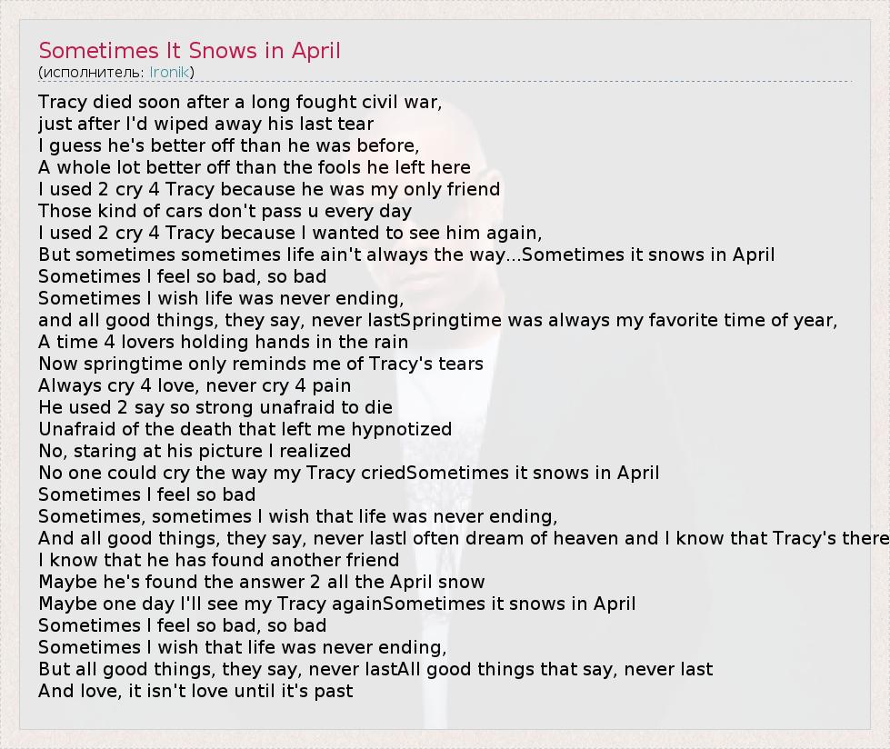 А как ты думаешь, о чем песня "Sometimes It Snows in April" ?