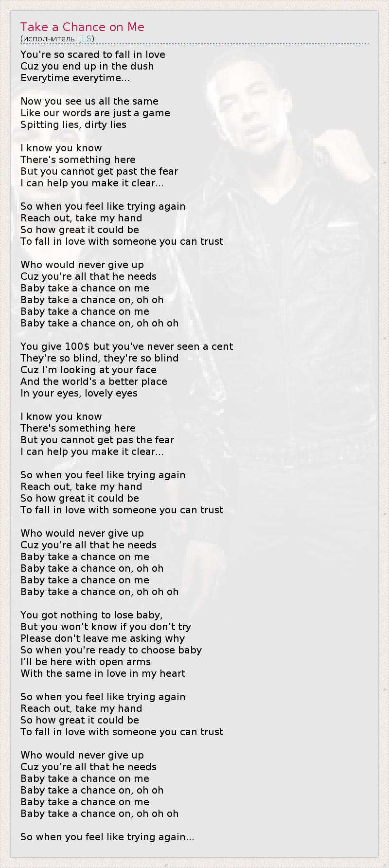 You're so scared to fall in love Cuz you end up in the dush Everytime everytime... Now you see us all the same Like our words are just a game Spitting lies, dirty lies I know you know There's something here But you cannot get past the fear I can help you make it clear... So when you feel like trying again Reach out, take my hand So how great it could be To fall in love with someone you can trust Who would never give up Cuz you're all that he needs Baby take a chance on me Baby take a chance on, oh oh Baby take a chance on me Baby take a chance on, oh oh oh You give 100$ but you've never seen a cent They're so blind, they're so blind Cuz I'm looking at your face And the world's a better place In your eyes, lovely eyes I know you know There's something here But you cannot get pas the fear I can help you make it clear... So when you feel like trying again Reach out, take my hand So how great it could be To fall in love with someone you can trust Who would never give up Cuz you're all that he needs Baby take a chance on me Baby take a chance on, oh oh Baby take a chance on me Baby take a chance on, oh oh oh You got nothing to lose baby, But you won't know if you don't try Please don't leave me asking why So when you're ready to choose baby I'll be here with open arms With the same in love in my heart So when you feel like trying again Reach out, take my hand So how great it could be To fall in love with someone you can trust Who would never give up Cuz you're all that he needs Baby take a chance on me Baby take a chance on, oh oh Baby take a chance on me Baby take a chance on, oh oh oh So when you feel like trying again...