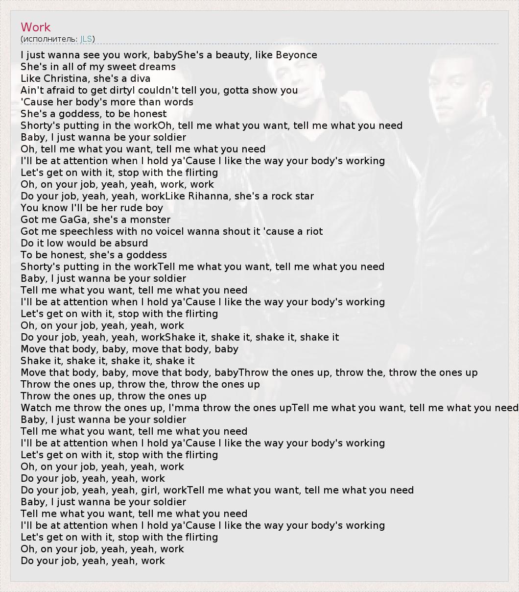Do your job, yeah, yeah, girl, workTell me what you want, tell me what you need