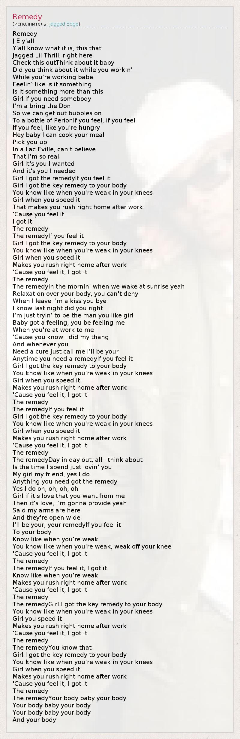 Remedy J E y'all Y'all know what it is, this that Jagged Lil Thrill, right here Check this outThink about it baby Did you think about it while you workin' While you're working babe Feelin' like is it something Is it something more than this Girl if you need somebody I'm a bring the Don So we can get out bubbles on To a bottle of PerionIf you feel, if you feel If you feel, like you're hungry Hey baby I can cook your meal Pick you up In a Lac Eville, can't believe That I'm so real Girl it's you I wanted And it's you I needed Girl I got the remedyIf you feel it Girl I got the key remedy to your body You know like when you're weak in your knees Girl when you speed it That makes you rush right home after work 'Cause you feel it I got it The remedy The remedyIf you feel it Girl I got the key remedy to your body You know like when you're weak in your knees Girl when you speed it Makes you rush right home after work 'Cause you feel it, I got it The remedy The remedyIn the mornin' when we wake at sunrise yeah Relaxation over your body, you can't deny When I leave I'm a kiss you bye I know last night did you right I'm just tryin' to be the man you like girl Baby got a feeling, you be feeling me When you're at work to me 'Cause you know I did my thang And whenever you Need a cure just call me I'll be your Anytime you need a remedyIf you feel it Girl I got the key remedy to your body You know like when you're weak in your knees Girl when you speed it Makes you rush right home after work 'Cause you feel it, I got it The remedy The remedyIf you feel it Girl I got the key remedy to your body You know like when you're weak in your knees Girl when you speed it Makes you rush right home after work 'Cause you feel it, I got it The remedy The remedyDay in day out, all I think about Is the time I spend just lovin' you My girl my friend, yes I do Anything you need got the remedy Yes I do oh, oh, oh, oh Girl if it's love that you want from me Then it's love, I'm gonna provide yeah Said my arms are here And they're open wide I'll be your, your remedyIf you feel it To your body Know like when you're weak You know like when you're weak, weak off your knee 'Cause you feel it, I got it The remedy The remedyIf you feel it, I got it Know like when you're weak Makes you rush right home after work 'Cause you feel it, I got it The remedy The remedyGirl I got the key remedy to your body You know like when you're weak in your knees Girl you speed it Makes you rush right home after work 'Cause you feel it, I got it The remedy The remedyYou know that Girl I got the key remedy to your body You know like when you're weak in your knees Girl when you speed it Makes you rush right home after work 'Cause you feel it, I got it The remedy The remedyYour body baby your body Your body baby your body Your body baby your body And your body