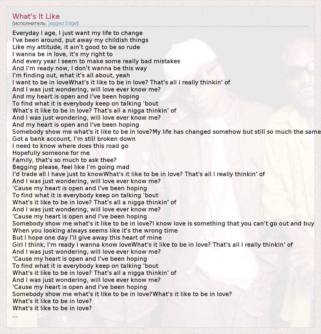 Somebody show me what's it like to be in love?What's it like to be in love?