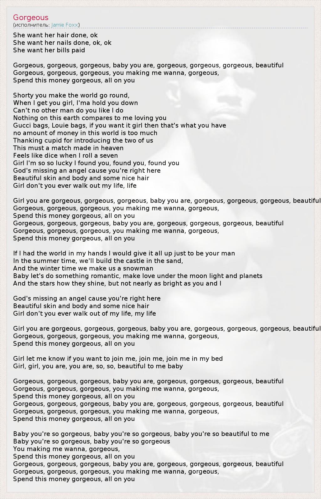 Gorgeous, gorgeous, gorgeous, you making me wanna, gorgeous,