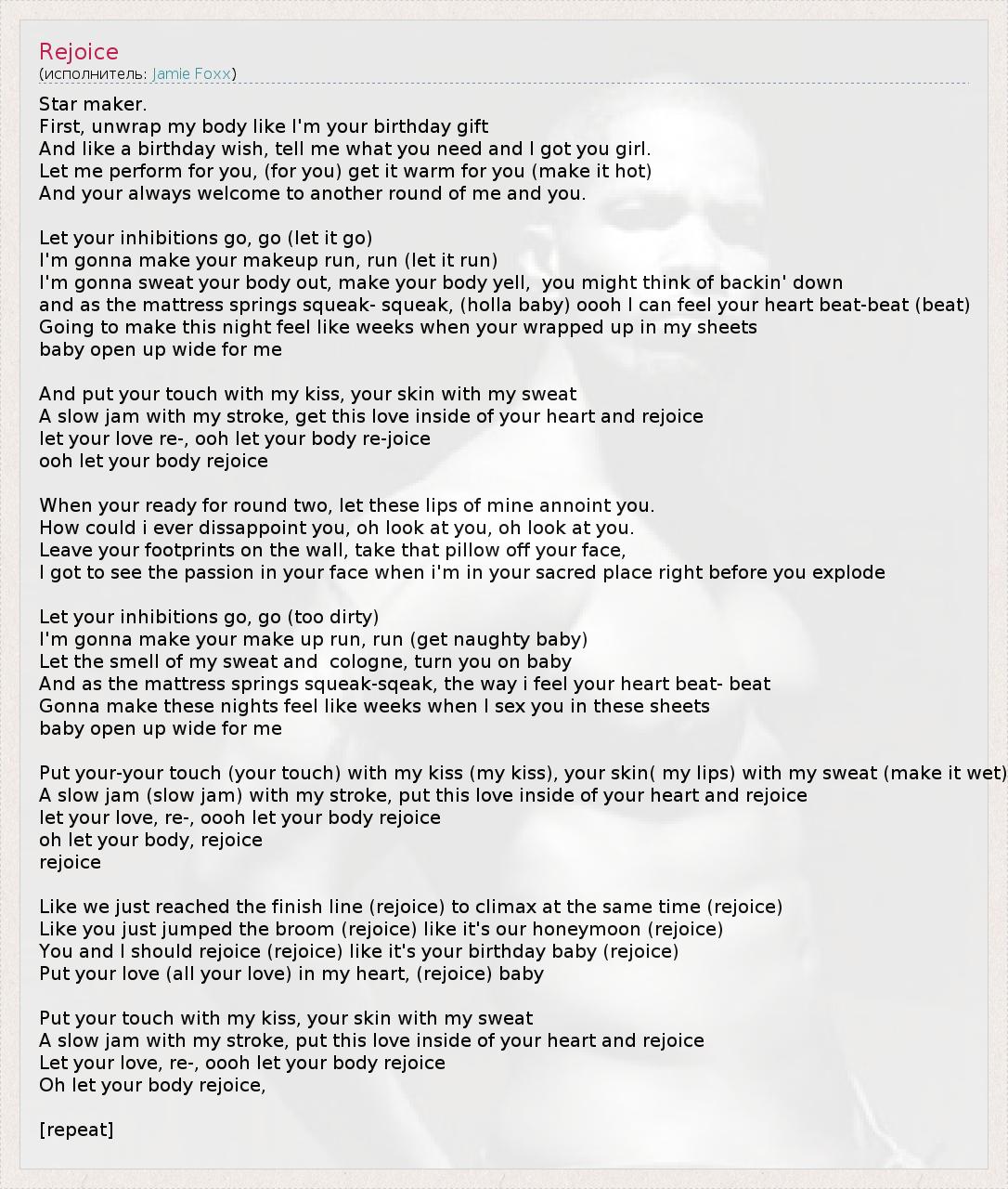 Star maker. First, unwrap my body like I'm your birthday gift And like a birthday wish, tell me what you need and I got you girl. Let me perform for you, (for you) get it warm for you (make it hot) And your always welcome to another round of me and you. Let your inhibitions go, go (let it go) I'm gonna make your makeup run, run (let it run) I'm gonna sweat your body out, make your body yell, you might think of backin' down and as the mattress springs squeak- squeak, (holla baby) oooh I can feel your heart beat-beat (beat) Going to make this night feel like weeks when your wrapped up in my sheets baby open up wide for me And put your touch with my kiss, your skin with my sweat A slow jam with my stroke, get this love inside of your heart and rejoice let your love re-, ooh let your body re-joice ooh let your body rejoice When your ready for round two, let these lips of mine annoint you. How could i ever dissappoint you, oh look at you, oh look at you. Leave your footprints on the wall, take that pillow off your face, I got to see the passion in your face when i'm in your sacred place right before you explode Let your inhibitions go, go (too dirty) I'm gonna make your make up run, run (get naughty baby) Let the smell of my sweat and cologne, turn you on baby And as the mattress springs squeak-sqeak, the way i feel your heart beat- beat Gonna make these nights feel like weeks when I sex you in these sheets baby open up wide for me Put your-your touch (your touch) with my kiss (my kiss), your skin( my lips) with my sweat (make it wet) A slow jam (slow jam) with my stroke, put this love inside of your heart and rejoice let your love, re-, oooh let your body rejoice oh let your body, rejoice rejoice Like we just reached the finish line (rejoice) to climax at the same time (rejoice) Like you just jumped the broom (rejoice) like it's our honeymoon (rejoice) You and I should rejoice (rejoice) like it's your birthday baby (rejoice) Put your love (all your love) in my heart, (rejoice) baby Put your touch with my kiss, your skin with my sweat A slow jam with my stroke, put this love inside of your heart and rejoice Let your love, re-, oooh let your body rejoice Oh let your body rejoice, [repeat]