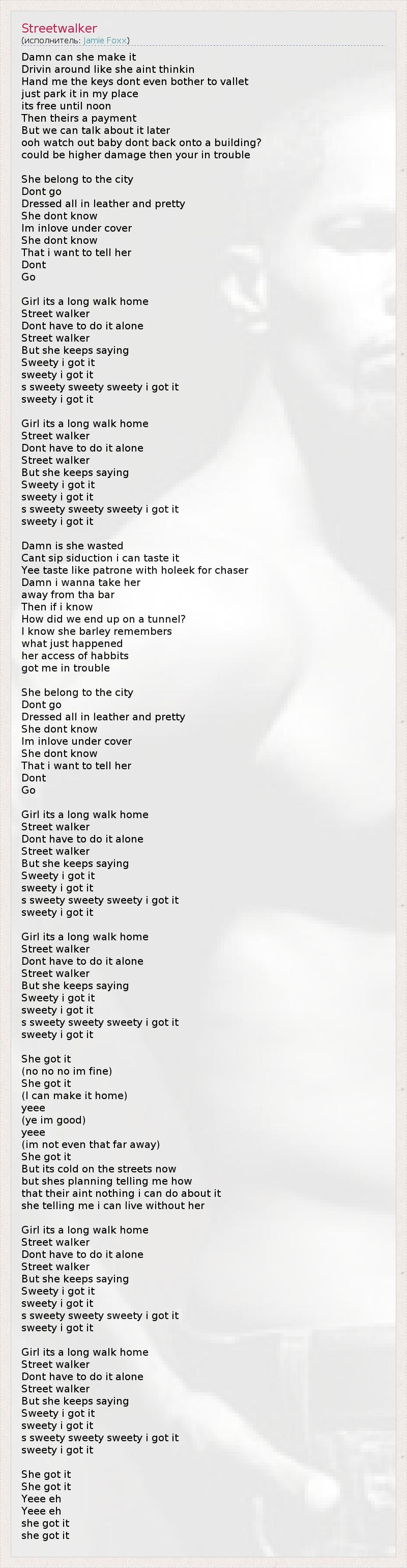 Damn can she make it Drivin around like she aint thinkin Hand me the keys dont even bother to vallet just park it in my place its free until noon Then theirs a payment But we can talk about it later ooh watch out baby dont back onto a building? could be higher damage then your in trouble She belong to the city Dont go Dressed all in leather and pretty She dont know Im inlove under cover She dont know That i want to tell her Dont Go Girl its a long walk home Street walker Dont have to do it alone Street walker But she keeps saying Sweety i got it sweety i got it s sweety sweety sweety i got it sweety i got it Girl its a long walk home Street walker Dont have to do it alone Street walker But she keeps saying Sweety i got it sweety i got it s sweety sweety sweety i got it sweety i got it Damn is she wasted Cant sip siduction i can taste it Yee taste like patrone with holeek for chaser Damn i wanna take her away from tha bar Then if i know How did we end up on a tunnel? I know she barley remembers what just happened her access of habbits got me in trouble She belong to the city Dont go Dressed all in leather and pretty She dont know Im inlove under cover She dont know That i want to tell her Dont Go Girl its a long walk home Street walker Dont have to do it alone Street walker But she keeps saying Sweety i got it sweety i got it s sweety sweety sweety i got it sweety i got it Girl its a long walk home Street walker Dont have to do it alone Street walker But she keeps saying Sweety i got it sweety i got it s sweety sweety sweety i got it sweety i got it She got it (no no no im fine) She got it (I can make it home) yeee (ye im good) yeee (im not even that far away) She got it But its cold on the streets now but shes planning telling me how that their aint nothing i can do about it she telling me i can live without her Girl its a long walk home Street walker Dont have to do it alone Street walker But she keeps saying Sweety i got it sweety i got it s sweety sweety sweety i got it sweety i got it Girl its a long walk home Street walker Dont have to do it alone Street walker But she keeps saying Sweety i got it sweety i got it s sweety sweety sweety i got it sweety i got it She got it She got it Yeee eh Yeee eh she got it she got it