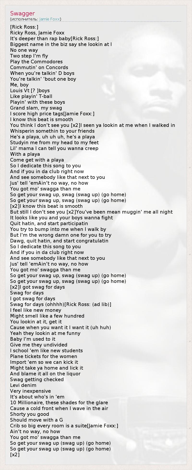 [Rick Ross:] Ricky Ross, Jamie Foxx It's deeper than rap baby[Rick Ross:] Biggest name in the biz say she lookin at I No one way Two step I'm fly Play the Commodores Commutin' on Concords When you're talkin' D boys You're talkin' 'bout one boy Me, boy Louis Vt [? ]boys Like playin' T-ball Playin' with these boys Grand slam, my swag I score high price tags[Jamie Foxx:] I know this beat is smooth You think I don't see you [x2]I seen ya lookin at me when I walked in Whisperin somethin to your friends He's a playa, uh uh uh, he's a playa Studyin me from my head to my feet Lil' mama I can tell you wanna creep With a playa Come get with a playa So I dedicate this song to you And if you in da club right now And see somebody like that next to you Jus' tell 'emAin't no way, no how You got mo' swagga than me So get your swag up, swag (swag up) (go home) So get your swag up, swag (swag up) (go home) [x2]I know this beat is smooth But still I don't see you [x2]You've been mean muggin' me all night It looks like you and your boys wanna fight Quit hatin, and start participatin You try to bump into me when I walk by But I'm the wrong damn one for you to try Dawg, quit hatin, and start congratulatin So I dedicate this song to you And if you in da club right now And see somebody like that next to you Jus' tell 'emAin't no way, no how You got mo' swagga than me So get your swag up, swag (swag up) (go home) So get your swag up, swag (swag up) (go home) [x2]I got swag for days Swag for days I got swag for days Swag for days (ohhhh)[Rick Ross: (ad lib)] I feel like new money Might smell like a few hundred You lookin at it, get it Cause when you want it I want it (uh huh) Yeah they lookin at me funny Baby I'm used to it Give me they undivided I school 'em like new students Plane tickets for the women Import 'em so we can kick it Might take ya home and lick it And blame it all on the liquor Swag getting checked Levi denim Very inexpensive It's about who's in 'em 10 Millionaire, these shades for the glare Cause a cold front when I wave in the air Shorty you good Should move with a G Crib so big every room is a suite[Jamie Foxx:] Ain't no way, no how You got mo' swagga than me So get your swag up (swag up) (go home) So get your swag up (swag up) (go home) [x2]